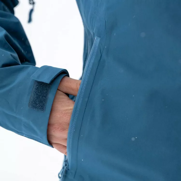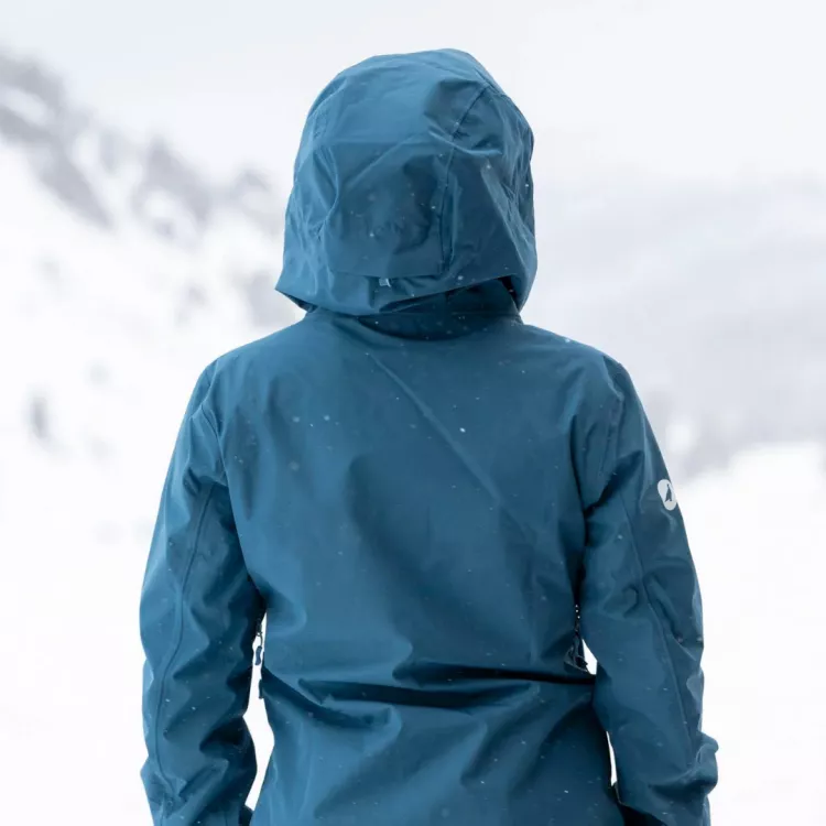 Grande capuche casque. Serrage par 3 points au niveau des clavicules et à l'arrière de la tête. Aucun trou ou oeillet sur la capuche: les mécanismes de serrage ne créent pas de point d'entrée pour l'eau, la neige ou le vent